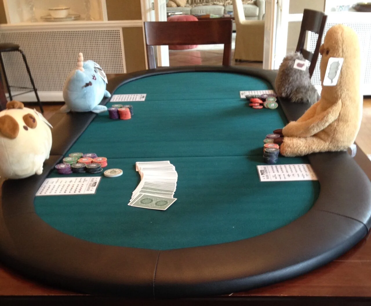 Last night Pip, Slothy, Asul, and Ruff Bader Ginsburg played Texas Hold’em which is a type of poker. Texas Hold’em was invented in Texas but it was introduced to Las Vegas in 1963 at the California Club by Corky McCorquodale, a professional poker player. Allegedly the invention of Texas Hold’em was by a Texas road gambler named Blondie Forbes, who was inducted into the Poker Hall of Fame in 1980 for his creation.